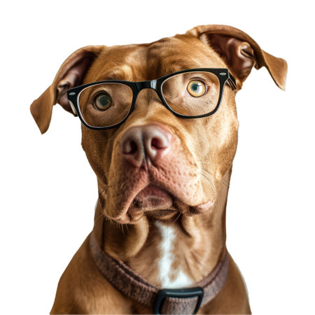 Brown pitbull dog with a curious expression wearing eyeglasses on a white background