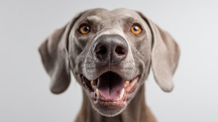 Weimaraner dog close up portrait, its mouth wide open, showing teeth and tongue, with expressive amber eyes, conveying happiness and companionship against a neutral background