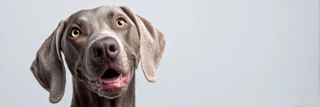 Weimaraner dog looking directly at the camera with a surprised and curious expression, its mouth slightly open, creating a humorous and engaging pet portrait
