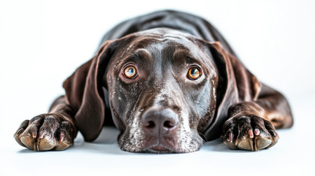 A heartwarming close-up of a brown dog lying on a white background, showcasing expressive eyes and a gentle demeanor, perfect for conveying emotion in pet-related projects.