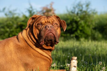 Dogue de bordeaux in black and white lying in the garden