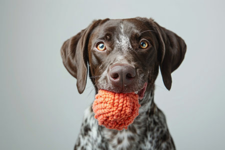 A playful dog holding a vibrant orange ball in its mouth, showcasing joy and personality against a simple backdrop.