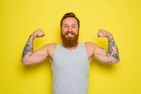 A bearded man flexes his bicep against a white backdrop. His determined expression and strong arm convey power and confidence.
