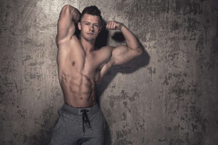 Confident sexy professional sportsman stands topless near the grey wall. Fitness, bodybuilding, Healthy lifestyle concept.
