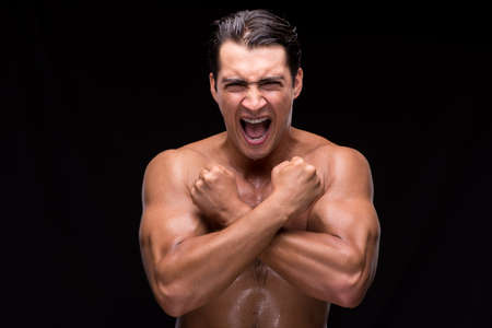 Strong Muscular guy. Power man body. Muscles body. Angry man. Aggressive expression. Screaming, Hate and Rage. Emotional Man Screaming. Emotional Face. Portrait of young Angry Man.