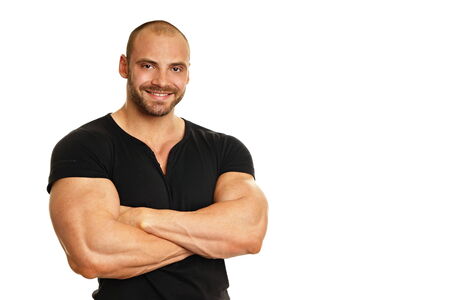 An handsome thirty-year-old man with strong triceps, broad shoulders, and massive biceps is smiling and working out every day.