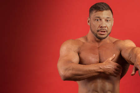 Young male athlete bodybuilder in a black sleeveless vest and shorts posing on a red background