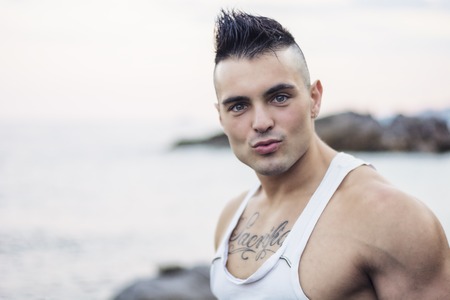 Handsome fashionable man model with hairstyle and muscular body wears a tank top and shows his abs in the studio on a dark background