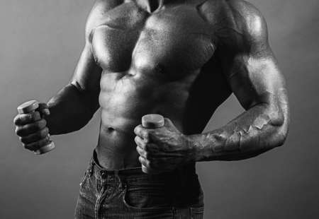 Muscular sexy fitness male body. Man posing shirtless on gray background. Athletic young man with naked torso with dumbbells. Strength and motivation gay concept. Fitness with small dumbbells.