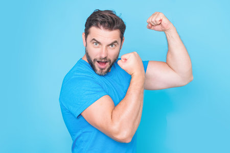 Smiling young bearded guy 20s in white singlet posing isolated on pastel blue wall background studio portrait. Sport fitness healthy lifestyle concept. Mock up copy space. Showing biceps, muscles.