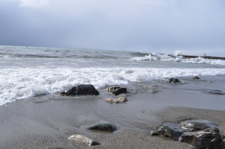 panoramic view of Batumi beach. Sea waves, stone shore with white foam. Georgia