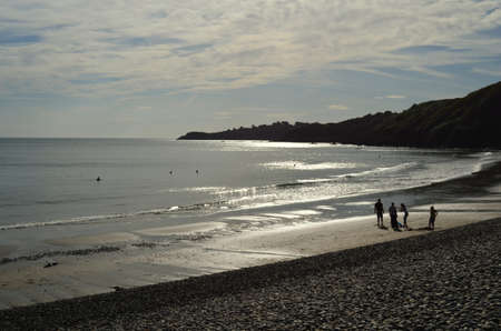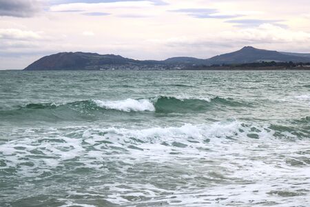 Wales, the Llyn peninsula, a view from Bryn Mor Beach to peaks that are the backbone of the area. Late summer afternoon sun, with waves on the sea on a windy day. Natural beauty, fresh air and health.