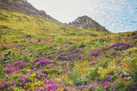 Scenic view of heather meadows on Cape d'Erquy, one of the most popular tourist destinations in Brittany, France. Widely known tourist attraction along famous GR34 tracking path