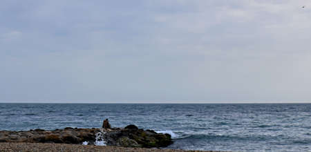 A man sits on a rocky seashore and looks into the distance. The waves crash against his feet. A bird is flying high in the sky. Evening. Sunset. Quiet and sad. soft focus. Blur.