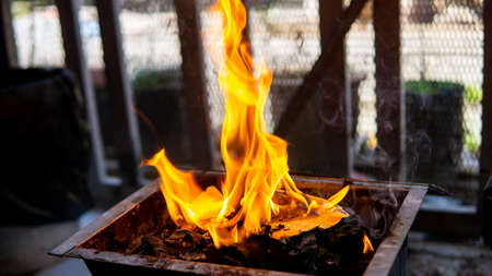 Burning dry branches in the brazier. Photo in the daytime.