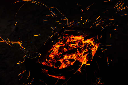bright orange sparks from a campfire on long exposure and smoldering coals. dynamics lines traces.