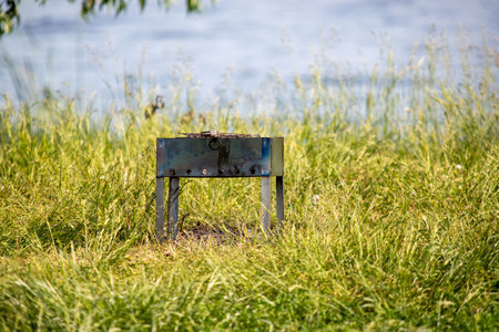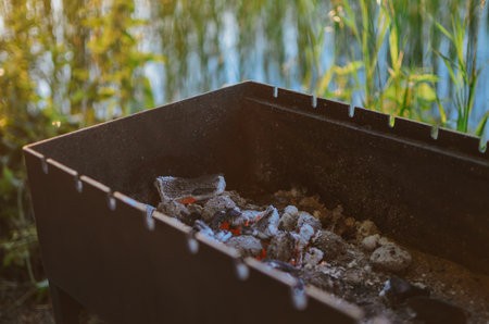 grill with hot coals for cooking grilled meat on the lake on a summer day