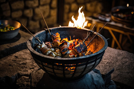 delicious grilled skewers in bowls on lit burning backyard grill, created with generative ai