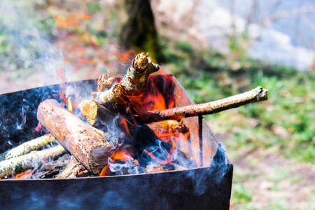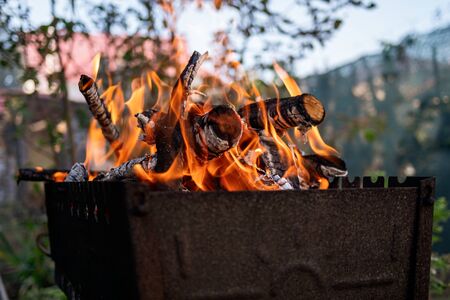 Firewood burning on a brazier. BBQ on the garden. Smoky bonfire. Fire for grill. Summer leisure activity