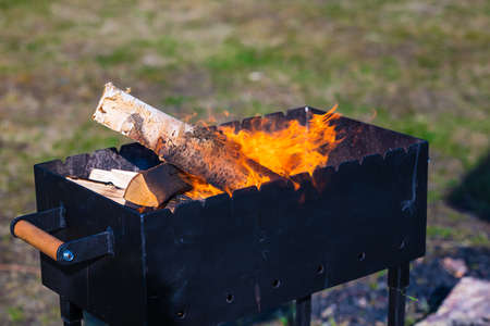 Homemade barbecue with burning wood. Concept of making a fire at home.