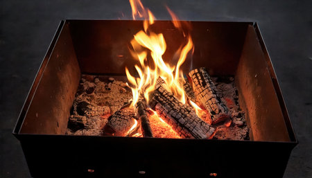 An overhead view reveals a bowl containing glowing red embers and flames. The scene is dominated by dark tones with hints of orange and yellow light, suggesting a nighttime environment. The composition focuses on texture and contrast, suitable for various editorial and commercial applications. The image evokes warmth.