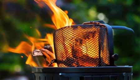 Flames emerge from burning charcoal in a grill set on lush grass. The warm sunlight creates a relaxed atmosphere perfect for cooking and enjoying food outdoors.