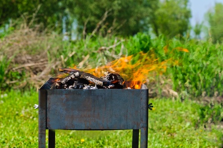 Rustic barbecue with burning firewood at a picnic in the village.