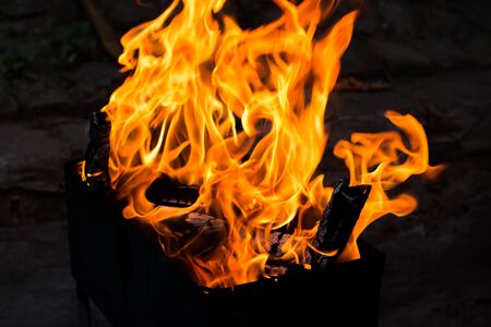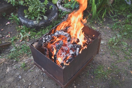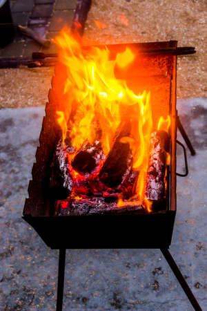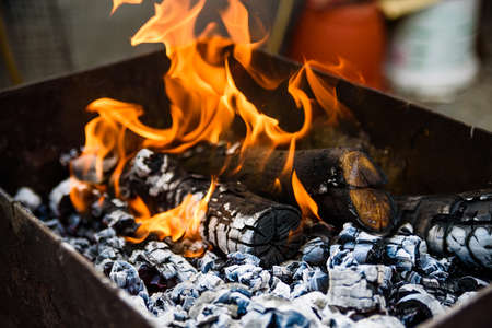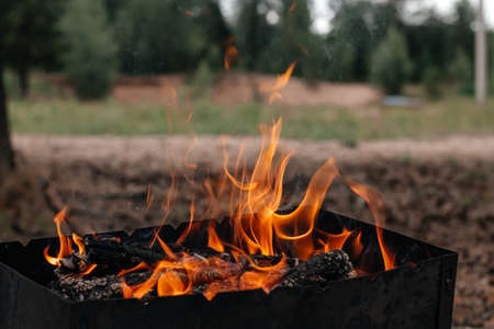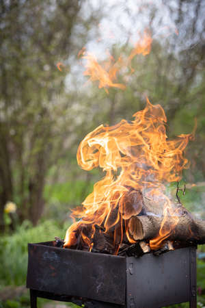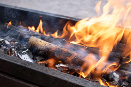 Barbeque grill fire. Burning wood and coal in the grill and BBQ.
