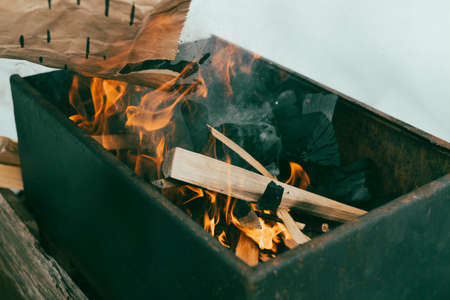 Firing a barbecue in the home garden. Flames floating above charcoal. Spring season.