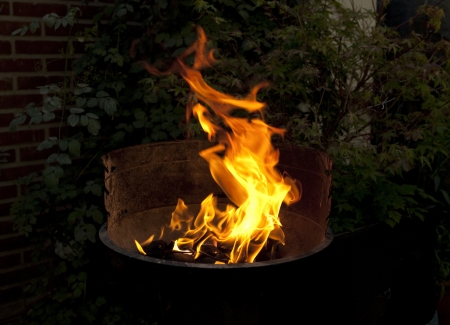 burning firewood in a brazier in the garden, fire flames outdoors