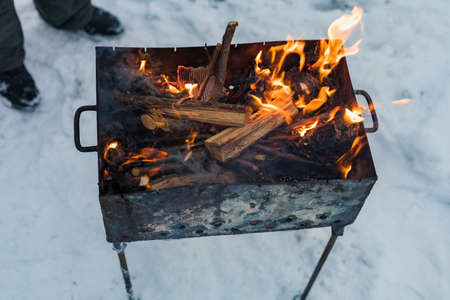 Man throws chips and firewood are burning in a homemade black chargrill against the background of snow. Winter weekend picnic.