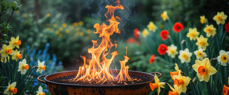 AI Generated. Flames Dancing on a Barbecue Grill in a Lush Garden Setting