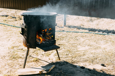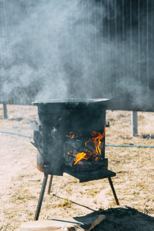 Steel kazan, a large cast iron cauldron, on a fire pit for cooking outdoors. Outdoor cooking concept with wood burning stove