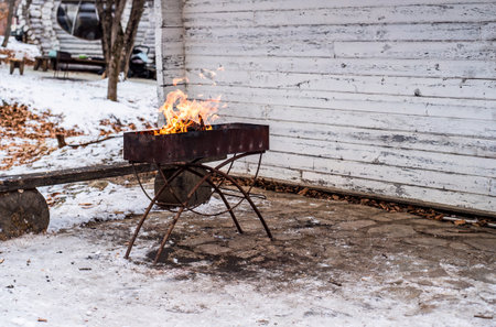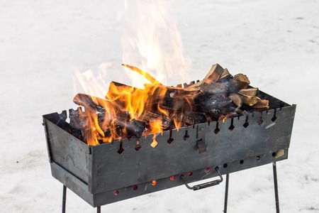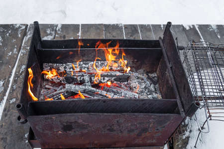 burning wood with fire in a barbecue grill in winter without people, copy space