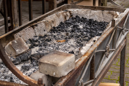 Hearth in a metal brazier. Lighting a fire for cooking barbecue.