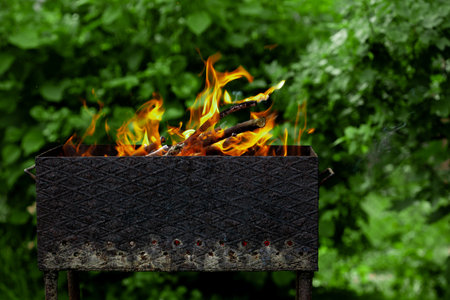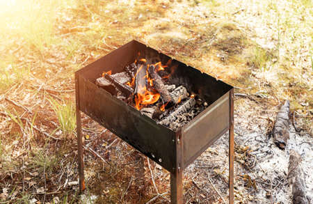 Barbecue grill with burning coals of flame. Outdoor celebration in the park. Preparing the grill for cooking a barbecue or steak.