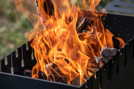 Birch firewood burns with red flames in a black metal grill on a sunny summer day.