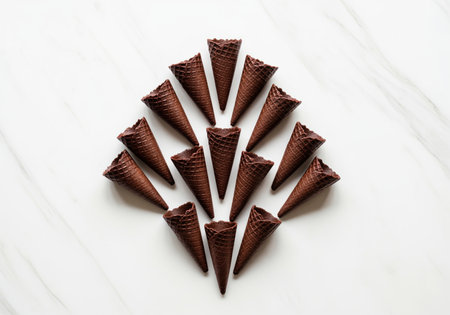 Many dark chocolate ice cream cones are arranged symmetrically in a geometric pattern, creating a visually appealing flat lay composition.