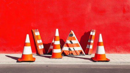 A collection of orange and white traffic cones arranged against a striking red wall, highlighting urban safety and construction themes in a visually engaging manner.