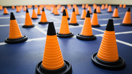 A vivid display of orange traffic cones set on a blue gym floor, creating a visually striking pattern ideal for training, exercise, or sports activities.