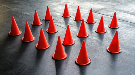 A collection of vibrant red traffic cones is strategically arranged on a dark rubber floor, perfect for training sessions and safety drills.