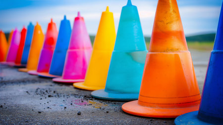 AI Generated. Colorful Traffic Cones with Blurred Background
