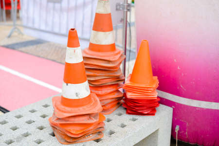 Picture of many striped road cones beside road. Warning symbols for traffic control on blurred outdoor background.