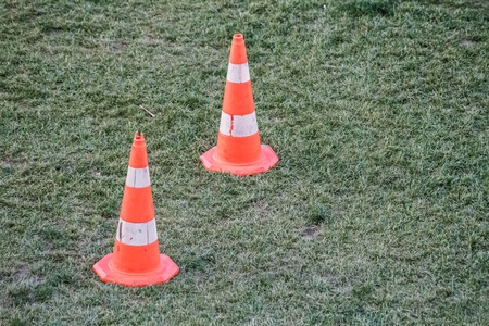 Traffic warning cones in the green grass playground