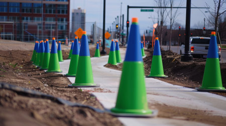 Bold green and blue cones form a winding path guiding pedestrians away from the busy construction zone