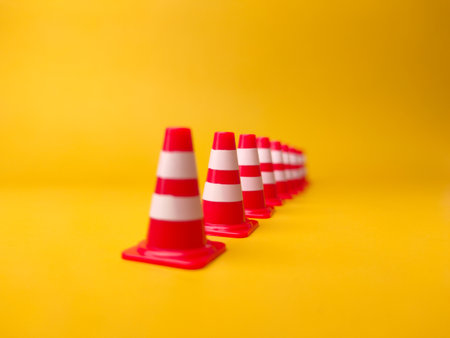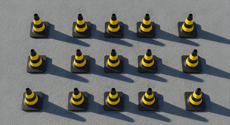 This striking image features a neat arrangement of black and white traffic cones against a vibrant yellow background, highlighting safety and urban design.