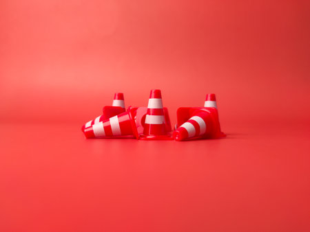 A row of red plastic cones on a table with white background, AI