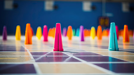Basketball training cones on wooden floor. Colorful training equipment at basketball practice court