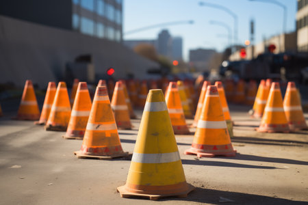 Bright orange cones line a bustling city street under sunlight, creating a barrier for ongoing construction and adding a vibrant safety element to urb