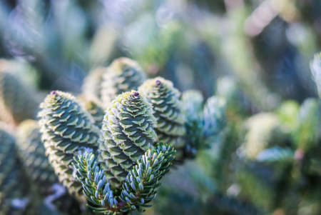 A branch of Korean fir with cones in the garden on a blurred background